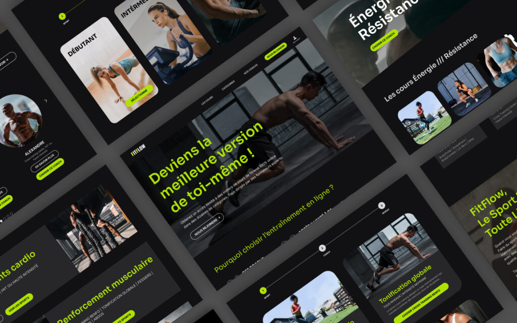 Maquette Figma d’une plateforme de cours de sport en ligne, centrée sur l’expérience utilisateur.